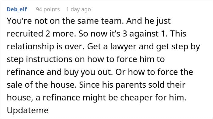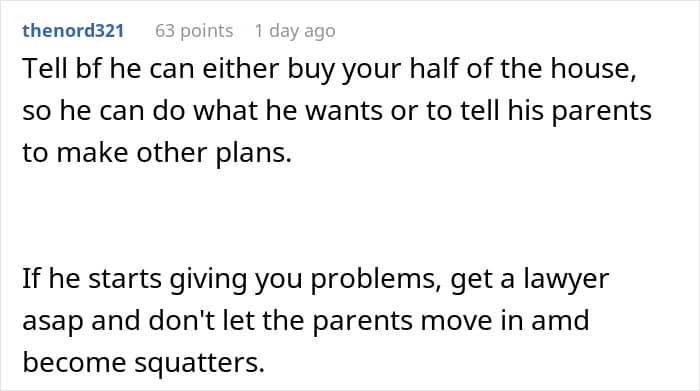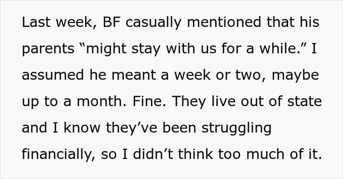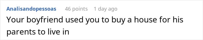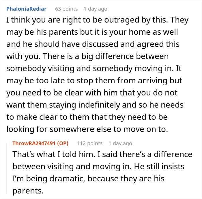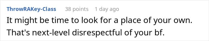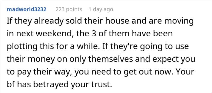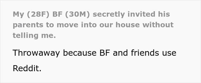 This unspoken agreement became a problem for these sweethearts when the man suddenly decided to have his parents live with him and his girlfriend in their shared home. The woman rightly felt betrayed, but her partner simply dismissed her grievances as an overreaction.