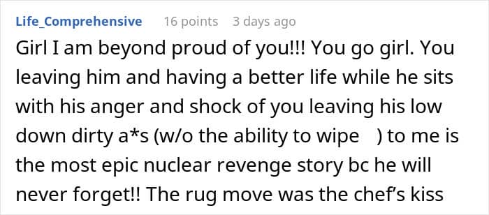 Many also applauded her for walking away from the relationship, and some shared similar stories of petty revenge
