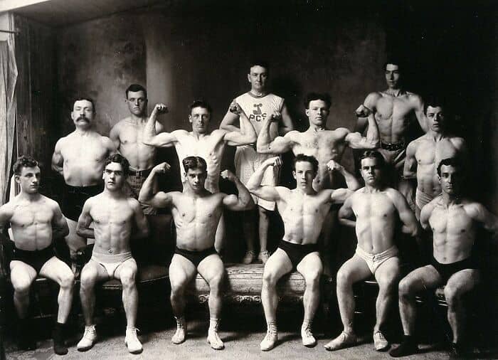 It’s an all-you-can-eat buffet of man meat in this delectable selection of early 20th century bodybuilders or wrestlers of the Physical Culture Society of Montreal, Canada, posing with their trainer in a photographic studio 1905 By: Gordon. Credit: @wellcomelibrary, London.