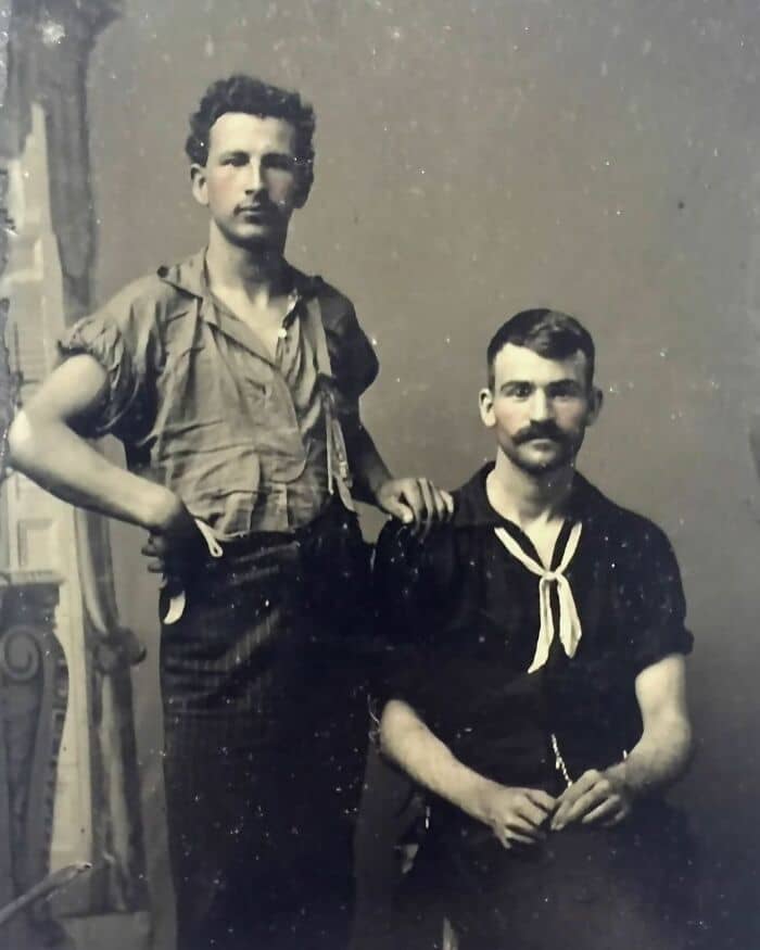 When life gets tough, lean on a friend. I’m utterly smitten with the chap on the right. Those smiling eyes and marvelous moustache…adorable! Sadly I’ve no information on this one, but I had to share it with you all.