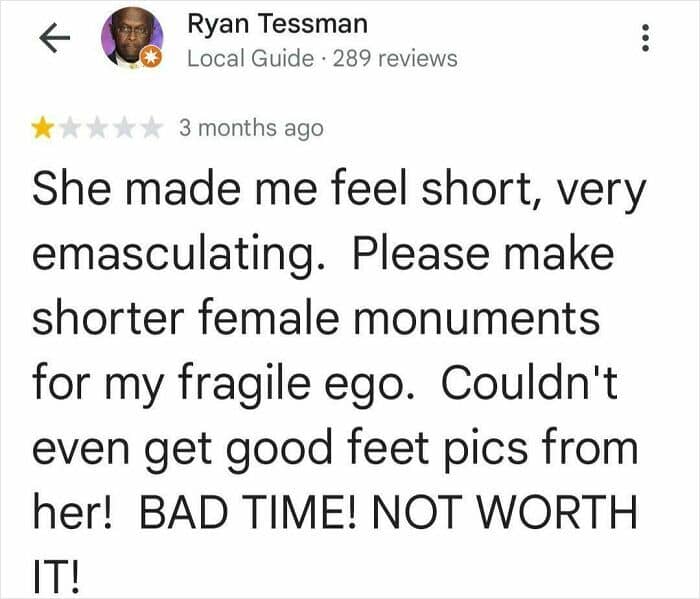 And then there are the people who clearly have no idea what reviews are. A review of a museum: “One star didn’t go inside.” A review of a coffee shop: “Four stars, haven’t tried the coffee yet.” That’s rating a book you never opened or Yelp feedback for your neighbor’s dog for barking once.