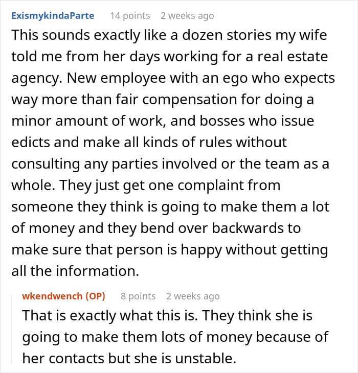 When asked whether they had ever attempted to address the issues directly, the poster said they tried but were met with dishonesty or emotional reactions. Still, they stood firm, particularly when it came to the question of splitting the commission. After explaining their side to management, they ultimately supported their decision not to share the earnings.