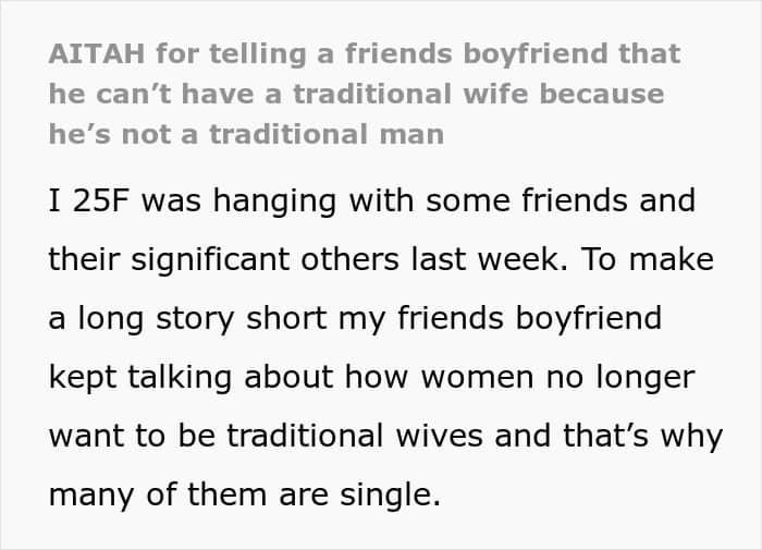 A woman shared how she called out her friend’s boyfriend after he ranted about ‘traditional wives.’ He was incredibly upset when this happened