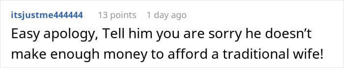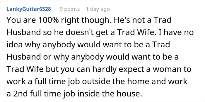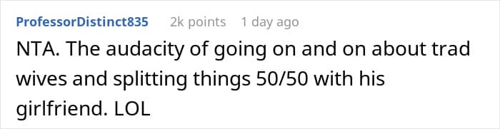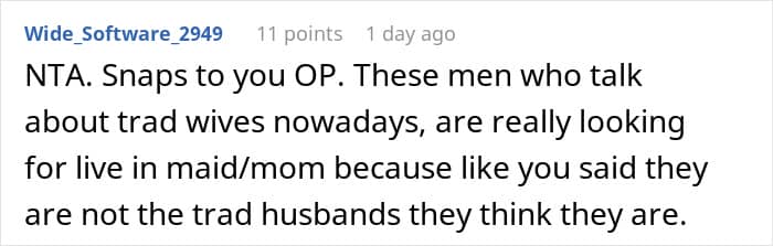 Internet user u/yftdddtf went viral after asking the AITAH online community whether she was wrong to call out her friend’s boyfriend. The man had gone on a massive rant about how women no longer wanted to be ‘trad wives.’ Having had enough, the woman told him off, noting that he’s not exactly a ‘trad husband’ either, which made him very upset. You’ll find the full story, including the internet’s comments, below.
