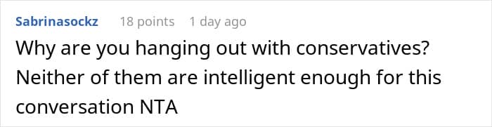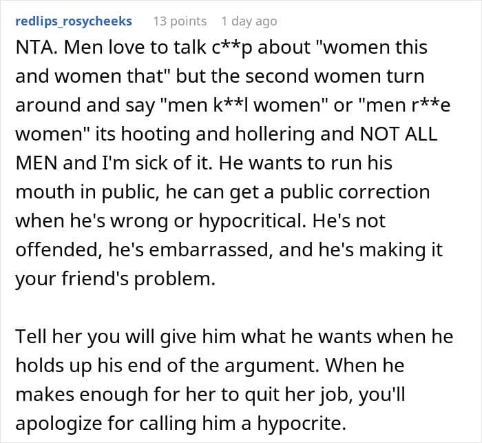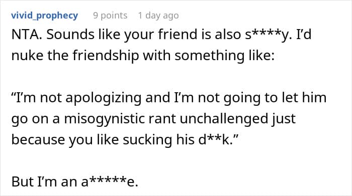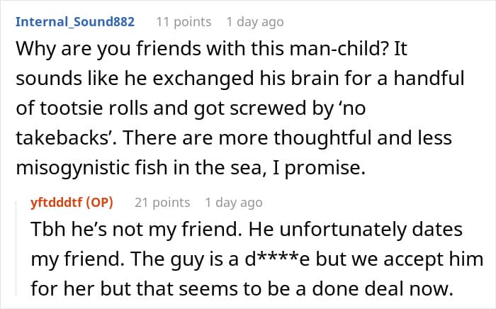 At the time of writing, the woman’s post got 17k upvotes and 2k comments. She noted that because she called out her friend’s boyfriend for his rant, her friendship was effectively over. We’ve reached out to the author for comment, and we’ll update the article as soon as we hear back from her.
