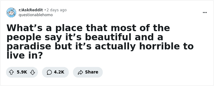 However, tourists and locals often see places from polar opposite perspectives. The former need restaurants, beaches, and a forgiving currency exchange rate, while the latter are more interested in hospitals, schools, and job opportunities. To explore the mismatch further, let’s take a look at a Reddit thread where people have been listing cities, countries, and regions that are beautiful to visit but not to live in.