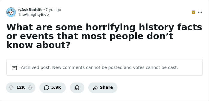 But most people usually want to learn about something nice, something that inspires, moves them, or makes them smile, even though the dark side of history is equally—if not more—important. Today, it’s the latter that we’re focusing on. On the list below, you will find stories shared by members of the ‘Ask Reddit’ community after one user asked them for horrifying facts and events that are not widely known, even though they arguably should be. Scroll down to find them but browse them at your own risk, as they shed light on some of the most gruesome parts of our history.