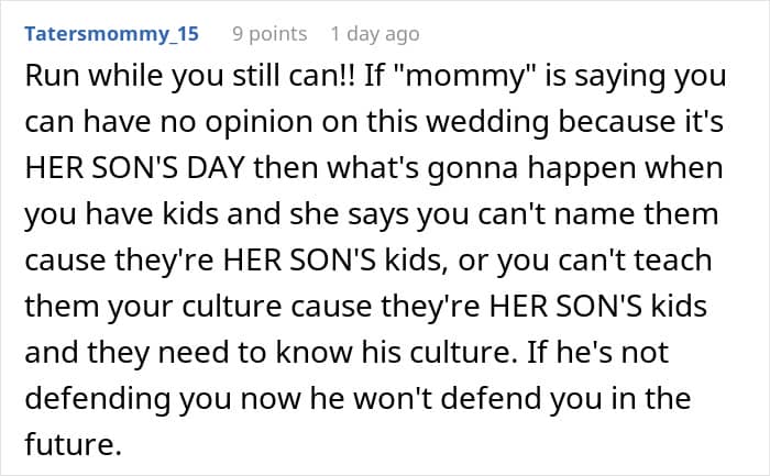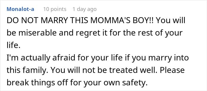 The connection between the woman’s (former) fiancé and his mom is undeniable. “Couples often come together with a feeling of newly discovered love, but the passionate and absorbing bond with a parent is the infant’s first experience of loving, and of being one person of a loving pair,” psychologist Terri Apter, Ph.D., says.