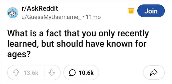 Someone asked “What is a fact that you only recently learned, but should have known for ages?” and netizens shared their best examples. So get comfortable as you scroll through, upvote your favorites and be sure to comment your own stories below.