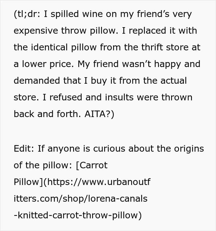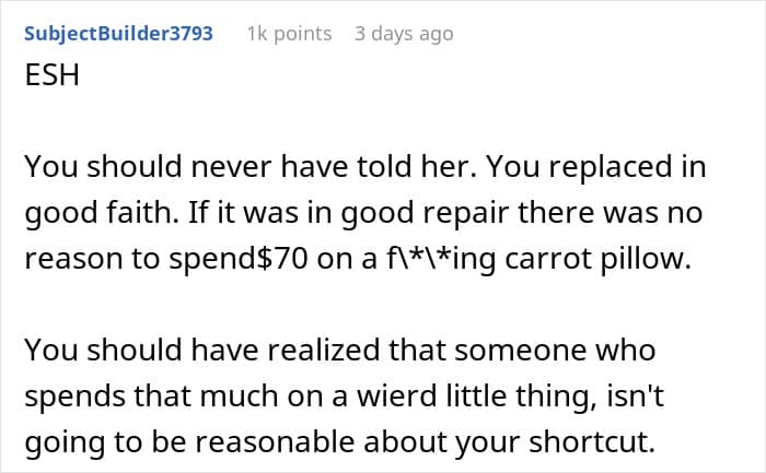 People in the comments on the original post also had significant differences of opinion. Some folks believed that both women were equally to blame. “You should never have told her. You replaced in good faith. If it was in good repair there was no reason to spend $ 70 on a [damned] carrot pillow,” someone wrote. “Her petty emotions about it aren’t actually your problem,” another responder added.
