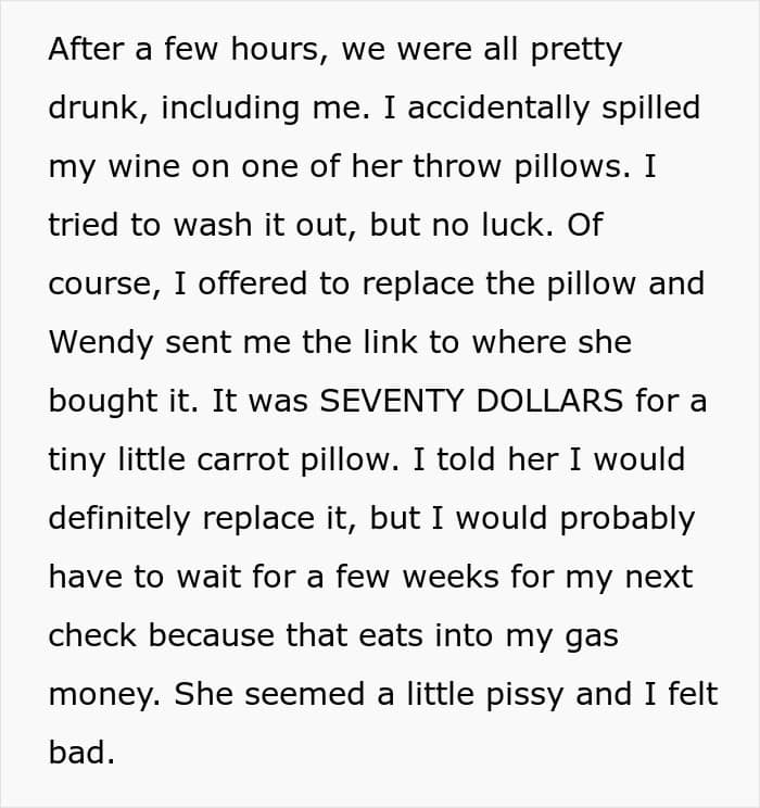 RELATED: The author of the post, a young woman, recently attended her friend’s housewarming party, where she spilled wine on a new throw pillow