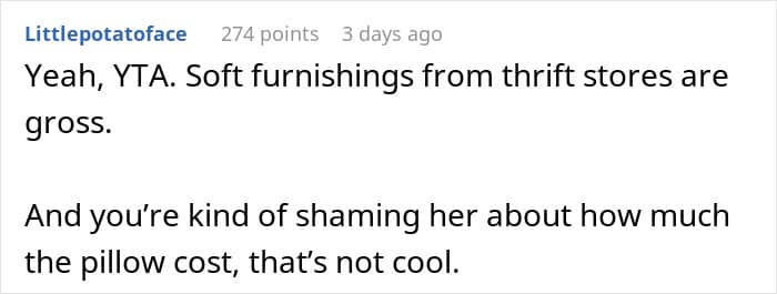 However, there were more among the commenters who were inclined to blame the author rather than her friend. “Soft furnishings from thrift stores are gross,” another person reasonably pondered. “And you’re kind of shaming her about how much the pillow cost, that’s not cool.” And what do you, our dear readers, think about this story?
