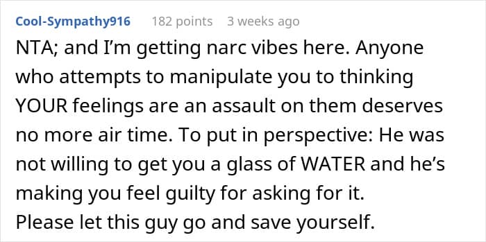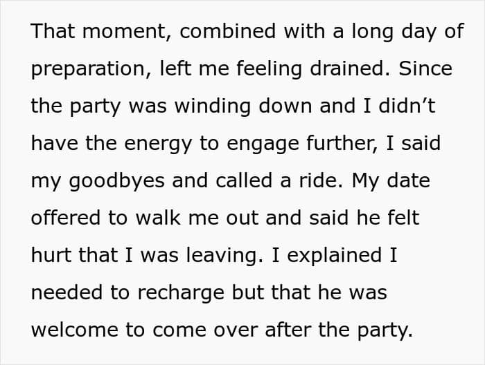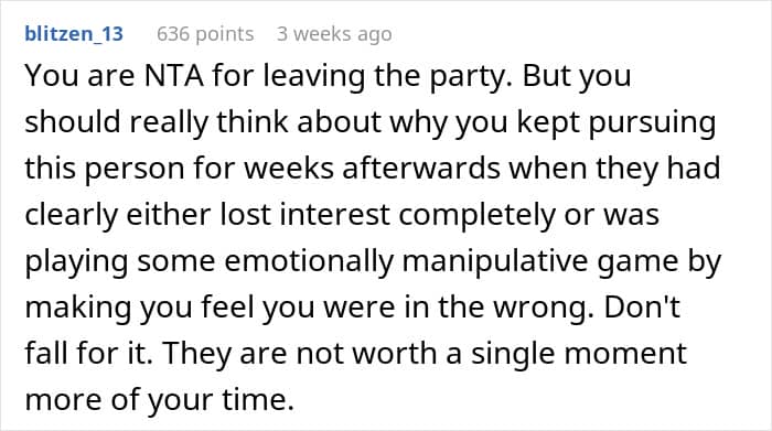 “If he held this belief, he might have mistakenly seen this request as a threat to himself and not only refused but got angry and gaslighted her about making it,” she added. Though the man acted in this way, he couldn’t believe the OP had decided to leave his friend’s party early. In fact, he felt hurt that his date was leaving, but he didn’t recognize the pain he had caused through his actions.