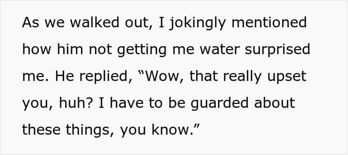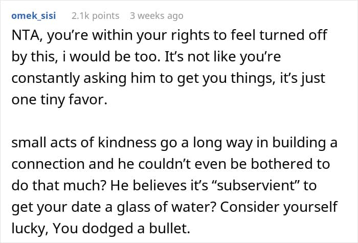 The OP tried to bring up the issue with their date later on because it was still a topic of contention between them. The man thenexplained that he felt getting water for someone wassubservient and thathe would only do it if the other person had earned it. The way of viewing this simple gesture was very different for both people.