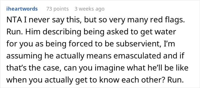 This is what happened to a person whose date refused to get them a glass of water. The guy’s reasoning was that doing so would be very submissive. This obviously didn’t go down well with the poster, who wondered whether to continue the relationship ahead.